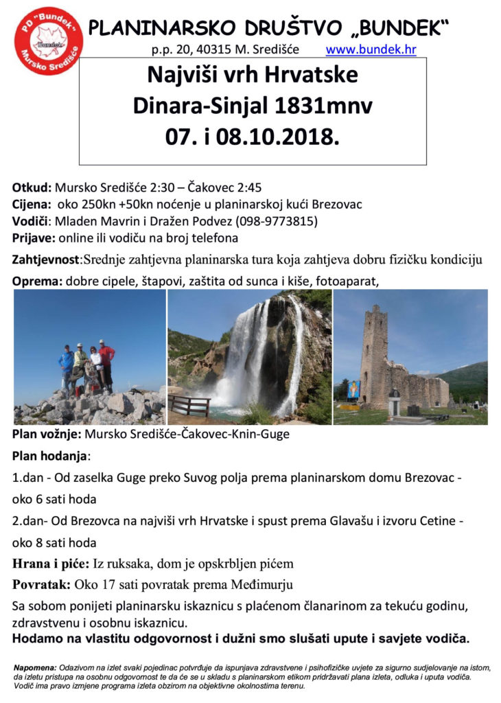 Pohod na najviši vrh Dinare – Sinjal (1831 mnv). Prijave se primaju do srijede, 03. listopada 2018. godine ili do popunjenja kvote od 35 ljudi, dalje ide lista čekanja (ograničenje zbog smještaja u planinarskoj kući Brezovac). Izlet je kondicijski srednje zahtjevan pa Vas molimo da to uzmete u obzir kod prijave. Odjaviti od izleta se možete do srijede, 03. listopada 2018. godine, dalje su odjave moguće samo ako postoji lista čekanja u protivnom Vas molimo da si sami pronađete zamjenu ili da platite kao da ste na izletu bili. Cijena prijevoza je oko 250 kn (zavisi od broja prijava) + 50 kn noćenje u planinarskoj kući Brezovac. Dom je opskrbljen pićem dok je prehrana iz ruksaka! Prijava i pregled prijava su online na linkovima ispod.